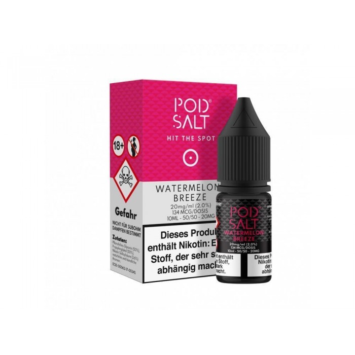 Sie bekommen 10ml des in UK produzierten Watermelon Breeze Nikotinsalz Liquid von der Marke Pod Salt in einer Stärke von 11mg/ml oder 20mg/ml. Das Premium Liquid kann sofort in Ihrer E-Zigarette verwendet werden. Während des Dampfens entfaltet das Nikotinsalz Liquid in Ihrer E-Zigarette einen Geschmack von einem Wassermelone und Menthol. Das Liquid hat ein Mischungsverhältnis 50VG und 50PG.